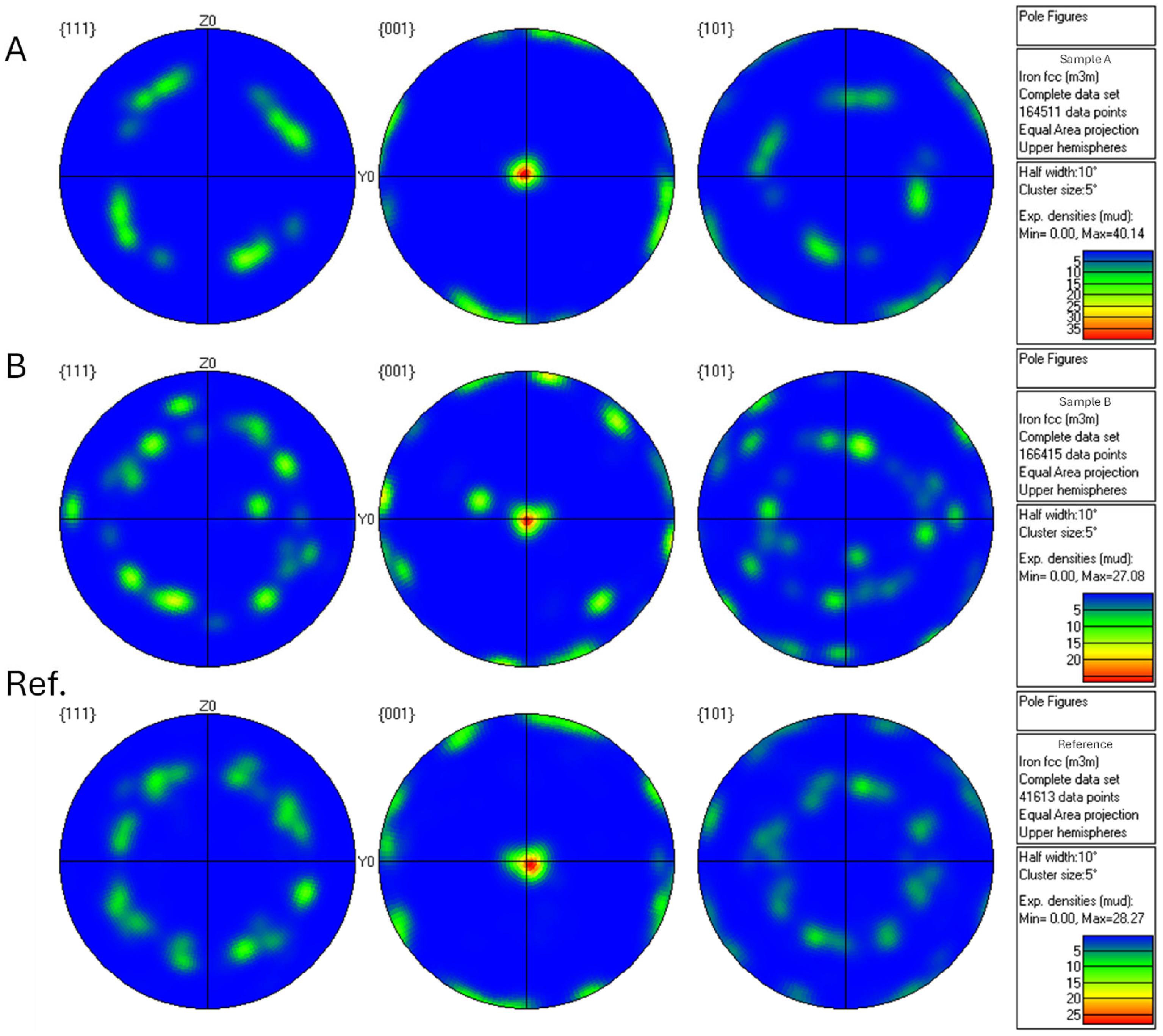 35]. When comparing the results of the B sample, whose chemical composition coincides more closely with that of Invar 36, it can be seen that its properties are still lower than those obtained for the same conventional alloy. This discrepancy may be attributed to the larger grain size and the absence of Nb. Comparative analysis with mechanical properties obtained confirmed that both Sample A and Sample B exhibited lower yield strength (Rp0.2) and ultimate tensile strength (Rm) compared to the reference alloy in both Z and X orientations. Sample A also showed higher elongation in the Z orientation, while Sample B did not show differences in elongation. When comparing Samples A and B, differences in strength were evident, particularly in Rm and elongation in the Z orientation, suggesting that even small compositional or microstructural variations can lead to measurable mechanical differences. Pole figure analysis supports this interpretation, revealing that Samples A and B—fabricated with higher thermal input—exhibit stronger crystallographic texture and larger columnar grains aligned with the build direction. Sample A, in particular, shows the highest texture intensity and the largest grain width, which correlates with its increased elongation and reduced strength.