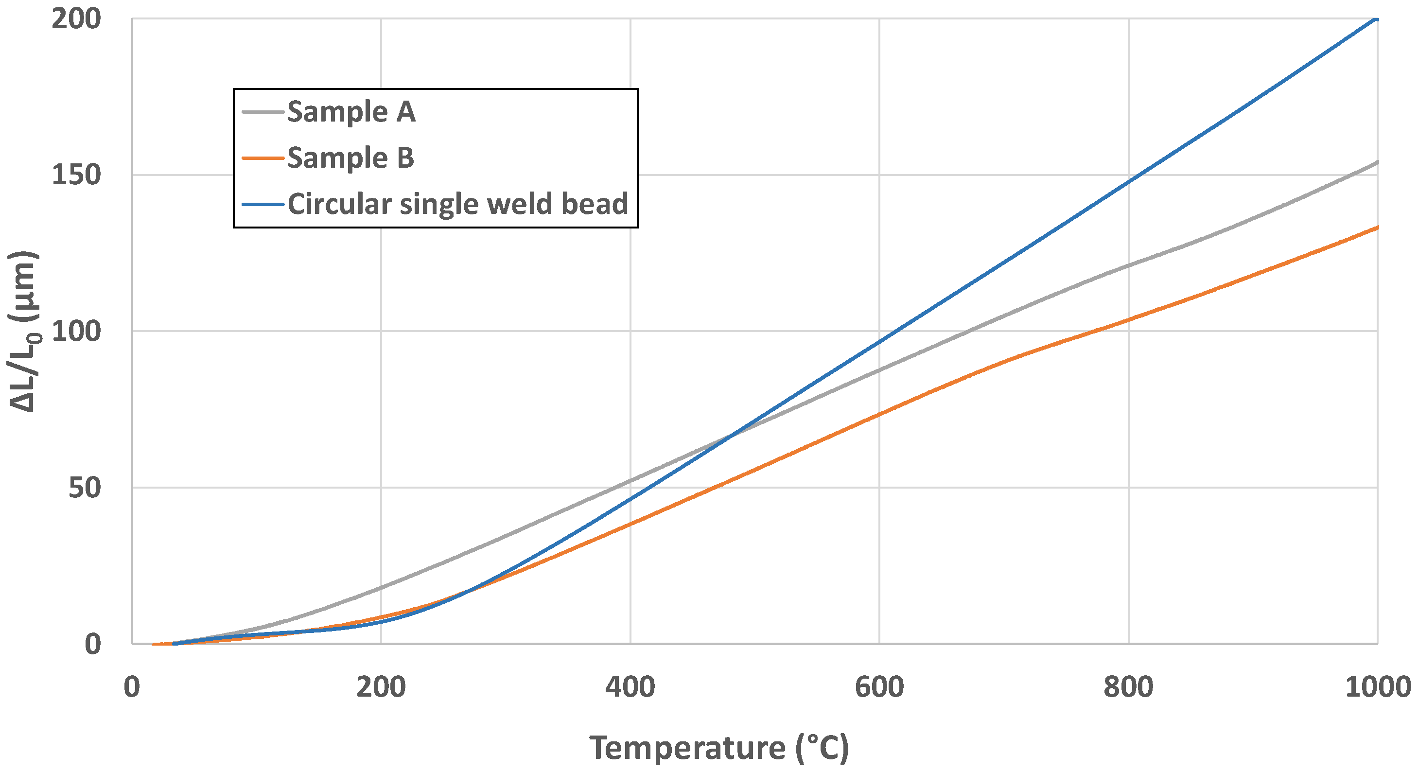 Dilatometry analyses were conducted using a Bähr DIL805A/D, TA Instruments Inc., New Castle, United States, deformation and cooling dilatometer, equipped with the Alpha measurement system (resolution ΔL/°C = 0.05 mm/0.05 °C). The Alpha measuring head incorporates low-expansion fused silica components in conjunction with a true differential Linear Variable Differential Transformer (LVDT), enabling high-precision thermal expansion measurements. This configuration facilitates accurate determination of the coefficient of thermal expansion (CTE). Specimens consisting of solid cylindrical samples with a diameter of 4 mm and a length of 10 mm were analyzed. The thermal cycle involved rapid heating of the specimens to a target temperature of 1000 °C, at a controlled heating rate of 5 °C/s. Temperature was measured via a type S thermocouple, and all experiments were carried out under an inert argon atmosphere to prevent oxidation and ensure thermal stability.