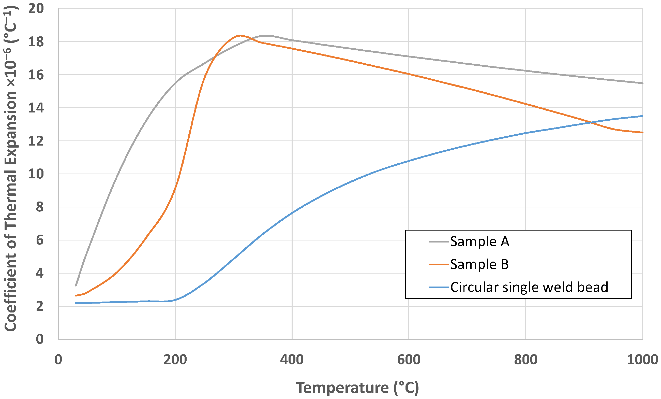 −1. These results indicate that Sample A shows the greatest thermal expansion and CTE increase at low temperatures, whereas Sample B remains closer to the reference material in terms of dimensional stability. Aldalur et al. [