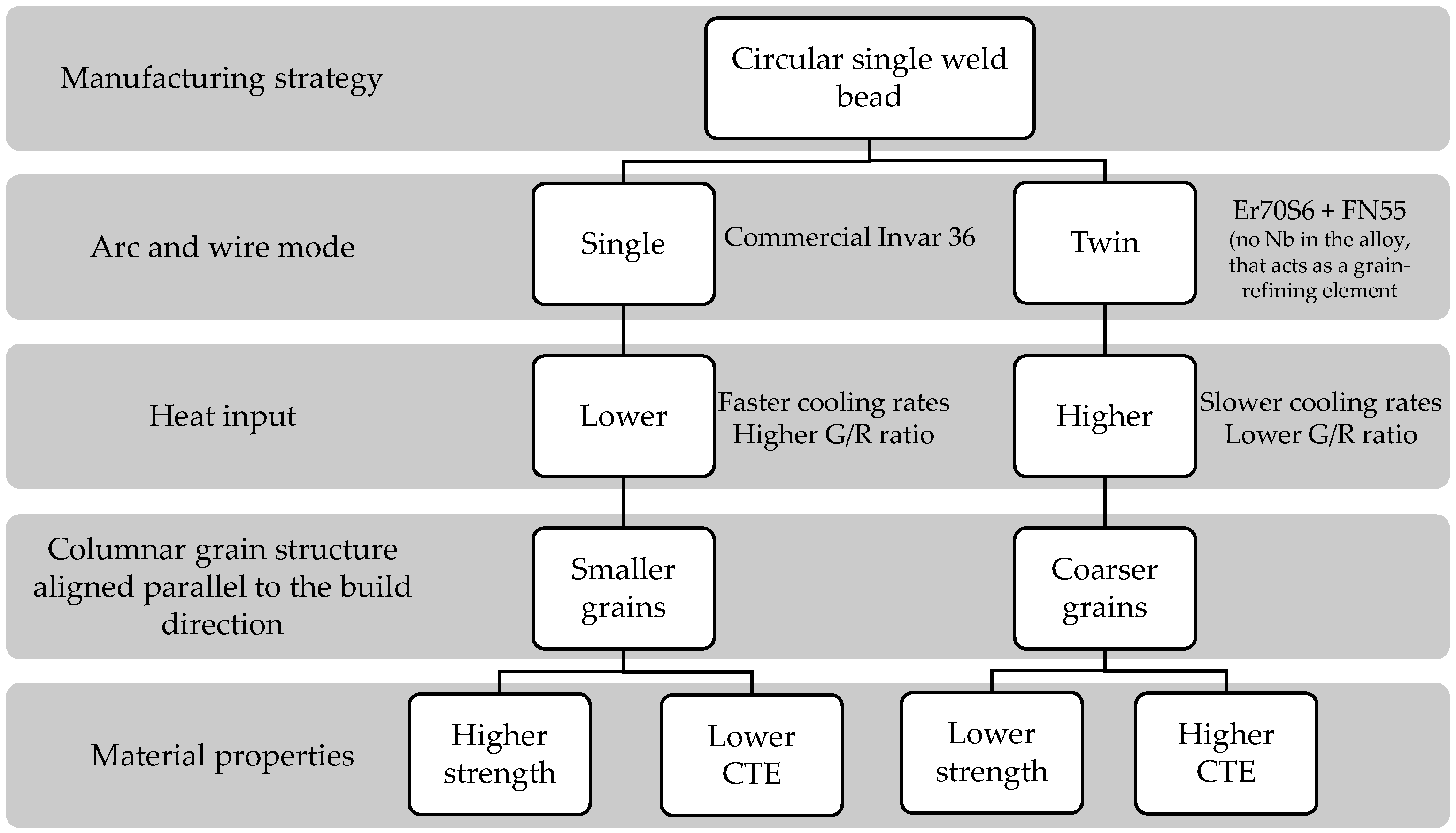 22]. Through AM using the tandem GMAW arc welding process, Invar can be applied in the desired areas while steel can be used for structural regions. The use of the tandem GMAW arc welding process offersthe advantages that, by using unique welding equipment and controlling the wires’ feed speed, the desired in situ alloy can be achieved. Yang et al. [