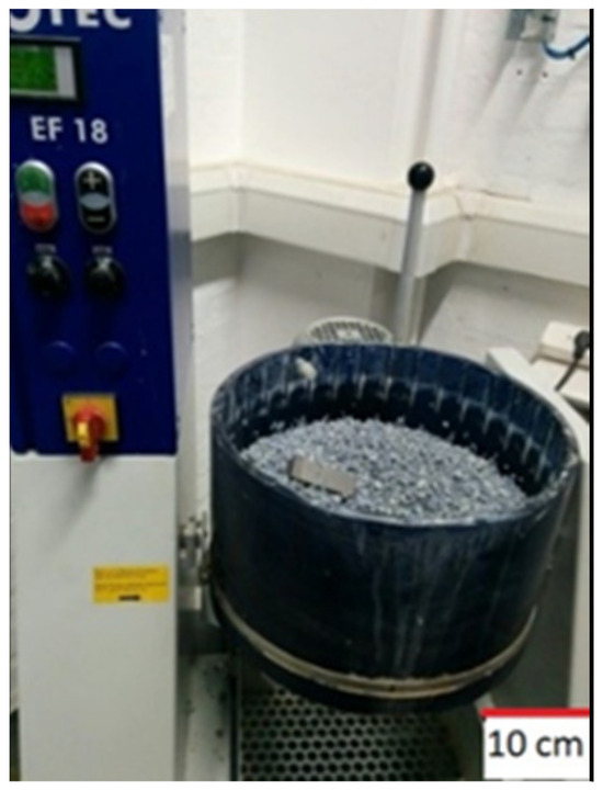 In the post-processing phase, surface finishing was performed using an OTEC CF18 Element Series centrifugal disc finishing machine (Figure 1). The finishing bowl was loaded with 18 tape water litres of ceramic abrasive media (product provided by OTEC, Straubenhardt–Conweiler, Germany), and the samples were placed into the finishing bowl to ensure uniform contact with the media throughout the process. Each sample underwent finishing for three hours at a rotational speed of 310 rpm. After completion of the finishing treatment, the samples were cleaned in an ultrasonic bath at 30 °C for 5 min to remove any residual debris or contaminants that could interfere with subsequent analyses [21].