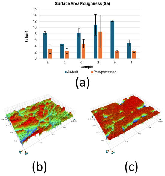 Figure 2a presents the variations in average surface roughness (Sa) for six samples in both as-built and post-processed conditions. The results demonstrate the consistent effectiveness of centrifugal mass finishing in improving surface quality. The Sa of the sample (Figure 2a) decreased from 8.20 ± 0.54 µm in the as-built condition to 3.05 ± 1.42 µm after processing, while the sample (Figure 2b) showed the most pronounced improvement, with Sa decreasing from 12.19 ± 0.26 µm to 2.67 ± 0.33 µm. Across all samples, three hours of treatment resulted in substantial reductions in roughness, confirming the repeatability of the finishing process. This quantitative trend is further supported by the surface topography images shown in Figure 2b,c. The as-built surfaces (Figure 2b) are characterised by a rough, irregular morphology with distinct asperities, whereas the mass-finished surfaces (Figure 2c) reveal a significantly smoother and more homogeneous finish, with a notable reduction in surface asperities and enhanced uniformity.