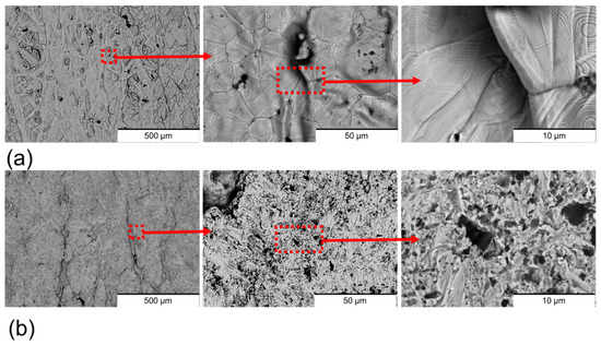 Cross-section BSE-SEM images of (a) non-polished surfaces and (b) polished surfaces. The zooms of the images are marked in red.
