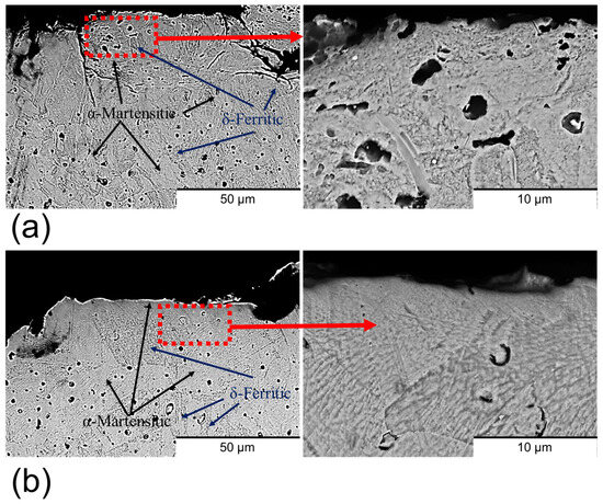 Cross-section imaging of the samples (Figure 4) revealed that both sample types exhibited a predominant α-martensitic microstructure with δ-ferrite phase [29,30,32]. However, differences in structural integrity were observed between the two conditions. The non-polished samples (Figure 4a) presented a high density of surface cracks, whereas these defects were absent in the polished samples (Figure 4b). This contrast is attributed to the rapid temperature fluctuations at the surface during sintering, which differ significantly from the thermal conditions within the bulk material. Such abrupt changes induce thermal stresses that are responsible for surface crack formation [33]. Importantly, the abrasive polishing removed the outer layer with cracks, containing these cracks.