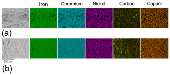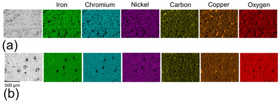 As illustrated in Figure 5, most elements were homogeneously distributed across both sample types, with carbon being the notable exception. Carbon exhibited a more heterogeneous distribution in the non-polished samples (Figure 5a) compared to the polished samples (Figure 5b). The carbon observed on the non-polished surface is attributed to incomplete removal of binder materials during sintering. The sintering process typically employs filaments composed of metallic alloys bonded with organic polymers. While the majority of the organic material is eliminated through thermo-chemical reactions, incomplete sintering can lead to carbonaceous residues originating from the polymers [30,32]. These residues exhibit low adhesion to the metallic surface and can be effectively removed by the polishing process, which accounts for the reduction in areas of high carbon concentrations in polished samples.