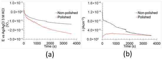 The AEN results (Figure 6) illustrate the temporal evolution of the potential (Figure 6a) and current density (Figure 6b). Both non-polished and polished samples exhibited an exponential decrease in potential over time. However, the temporal evolution of current density differed notably between the two sample types. In the case of the non-polished samples, the current density followed a similar trend to the potential decay. This correlation suggests that the surface underwent chemical evolution without significant changes in resistance. According to Ohm’s law, resistance is directly proportional to voltage and inversely proportional to current density [34]. Thus, the analogous behaviour of both parameters implies a relatively constant resistance throughout the measured period. In contrast, the polished samples displayed a nearly constant current density over time. This phenomenon, coupled with the observed potential decay, is indicative of chemical activation of the surface [35]. However, the corrosion kinetics remained unaffected by this activation process. The observed differences in current density behaviour between non-polished and polished samples are likely due to variations in carbon distribution and surface roughness. The enhanced homogeneity of the elements in polished samples appears to promote greater corrosion stability and more consistent corrosion kinetics [30].