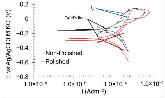 icorr was calculated by Tafel line extrapolation, whereas iol was measured from the vertical segment of the anodic branch of the PPC [44]. Both non-polished and polished samples exhibited comparable values for these parameters, indicating similar levels of kinetic corrosion resistance.