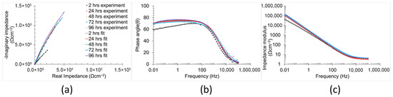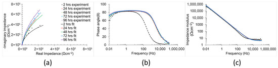 Electrochemical impedance spectra (a) Nyquist plots, (b) phase angle, and (c) impedance modulus Bode plots of polished samples in 0.6 M NaCl immersion at 2 h, 24 h, 48 h, 72 h, and 96 h.