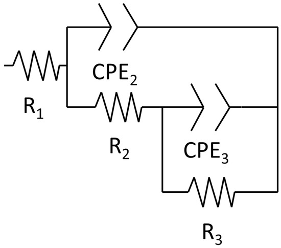A corrosion mechanism was identified for all immersion durations and sample types. The equivalent circuit model (Figure 10) consists of a resistance in series with two time constants. The plateau curve in the Bode impedance modulus (Zm) versus frequency (f) plot corresponds to the series resistance (R1). Each time constant consisted of a resistor (R2 and R3) in parallel with a constant phase element (CPE2 and CPE3). The first time constant was associated with the medium frequency range (100 Hz–104 Hz), as evidenced by the peak in the Bode phase angle (θ) versus frequency plot, the semi-loop in the Nyquist plots, and the slope of the curve in Zm versus f. The second time constant was also evident in the low frequency range (10−1 Hz–100 Hz), indicated by the broad peak in θ versus f and the corresponding slope change in Zm versus f. Notably, the constant phase element (CPE3) was in series with the resistor R2 from the preceding time constant. Identification of individual peaks for each time constant in the Bode plots (θ versus f) was complicated due to peak overlap [6,51,52].
