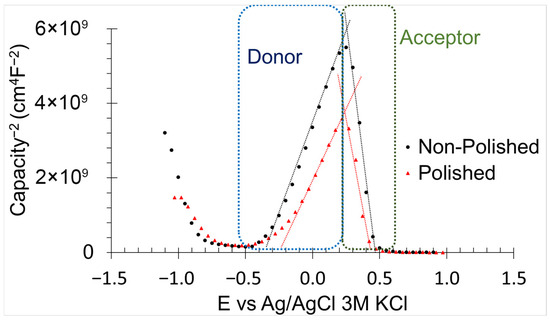 Defects within the oxidised layer of the samples, including electron donors and acceptors, were analysed using the Mott-Schoktty method (Figure 11). The electron donor density (Nd) and hole acceptor density (Na), as well as the flat band potential for donor (Efbd) and acceptor (Efba), were calculated using Equations (9) [60] and (10) [60] in conjunction with Mott-Schoktty method data.