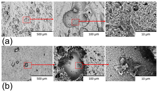 Surface BSE-SEM images of (a) non-polished surfaces and (b) polished surfaces. The zooms of the images are marked in red.