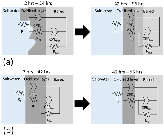 The proposed equivalent circuit corresponds to the corrosion mechanism identified. The equivalent circuit element was associated with a specific component of these corrosion mechanisms. For the first corrosion mechanism, R1 was related to the solution resistance (Rs), as it remained relatively constant throughout the distinct immersion periods [55]. The first time constant was linked to the oxidised layer, where CPE2 corresponds to the double layer formed by the charge alignment between the solution and oxidised layer (CPEol) [48]. R2 represented the oxidised layer resistance of the charge transference (Rol) [48]. The second constant time described the double layer (CPEbar) and charge transfer resistance (Rba) for the bare material.