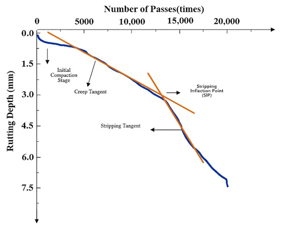 The Hamburg wheel-tracking test was conducted following AASHTO T324 specifications [26]. The test was conducted in a 50 °C water bath to simulate combined moisture and temperature conditions, evaluating both high-temperature performance and moisture damage resistance. A typical test result is shown in Figure 3, where the curve can be divided into three stages: initial compaction, creep, and stripping. A decrease in the creep slope indicates a reduced deformation rate during the creep phase, reflecting improved high-temperature stability. The intersection point of the fitted creep and stripping stage curves is identified as the stripping inflection point. A higher position of this point, indicating a greater number of load passes reached before stripping, reflects enhanced resistance to moisture damage and better overall moisture stability. Furthermore, a reduced slope in the stripping stage also signifies improved resistance to moisture-induced stripping. The test was terminated after 20,000 loading cycles.