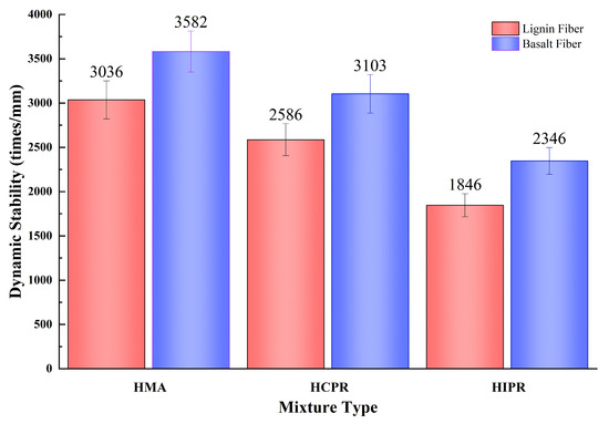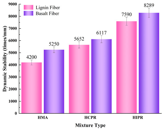 The results of the wheel tracking test for different asphalt mixtures are shown in Figure 4. Figure 4 shows that the high-temperature stability of hot recycled asphalt mixtures was significantly better than that of virgin hot mix asphalt. For the mixtures with lignin fiber, the dynamic stability of the hot central plant recycling (HCPR) mixtures increased by 34.6%. In contrast, the hot in-place recycling asphalt mixture achieved a more significant improvement of 80.7% when compared to the virgin mixtures. The greater enhancement in dynamic stability for the in-place recycled mixture is primarily attributed to its higher RAP content. The increased proportion of aged asphalt in the mixture results in greater overall hardness and enhanced resistance to high-temperature shear deformation [28].