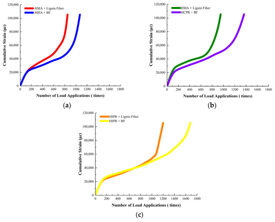 Cumulative strain curves from Dynamic Creep Test. (a) HMA (b) HCPR (c) HIPR.