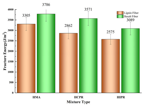 Furthermore, the incorporation of basalt fibers substantially enhanced the intermediate-temperature cracking resistance across all mixture types. Compared with lignin fiber-modified mixtures, the addition of basalt fibers increased the fracture energy (Gf) of virgin, hot central plant recycling, and hot in-place recycling mixtures by 14.5%, 24.7%, and 20.0%, respectively. This improvement indicates that basalt fibers enhance the energy absorption capacity of mixtures during cracking, thereby improving crack resistance. Correspondingly, the Flexibility Index (FI) values increased by 58.6%, 76.0%, and 52.4%, demonstrating that basalt fibers effectively retard crack propagation rates. This enhancement is attributed to the ability of basalt fibers to disperse and transfer loads within the mixture, resulting in more uniform stress distribution, reduced stress concentration, and consequently, improved resistance to crack propagation [32]. Notably, with basalt fiber addition, both Gf and FI of the hot central plant recycling mixture exceeded those of the virgin asphalt mixture. Meanwhile, the Gf of the hot in-place recycling mixture approached that of the virgin mixture, with its FI also showing a significant improvement. These findings confirm that basalt fiber incorporation can significantly improve the cracking resistance of hot recycled asphalt mixtures, thereby expanding their potential application scope.