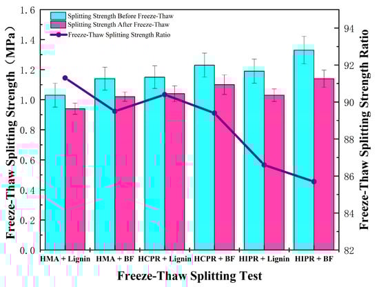 The freeze–thaw splitting test was executed according to T0729 of JTG E20. Moisture susceptibility was quantified by the tensile strength ratio (TSR), where a higher TSR value corresponds to enhanced resistance to moisture-induced damage.