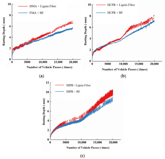Hamburg wheel-tracking test curves. (a) HMA. (b) HCPR. (c) HIPR.