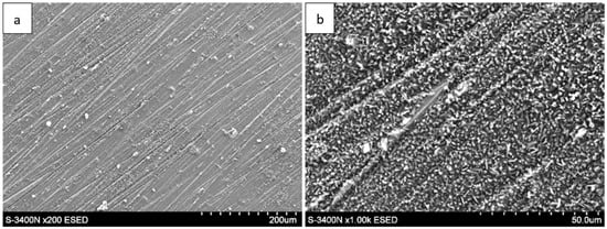 The surface morphology of the Fe40Al5Cr0,2TiB alloy after oxidation in water vapor at 700 °C evolved significantly with exposure time. After 1 h (Figure 1), a relatively continuous, fine-grained oxide layer covered the surface, consisting mainly of needle-like structures (whiskers) and small agglomerates (flakes). These elongated oxides grew perpendicularly to the substrate, forming a columnar morphology typical of the metastable θ-Al2O3 polymorph [1,2,5]. As the exposure time increased to 50 h (Figure 2) and 100 h (Figure 3), whisker density decreased, and the oxide became denser, forming clustered grains with a partially flattened morphology.