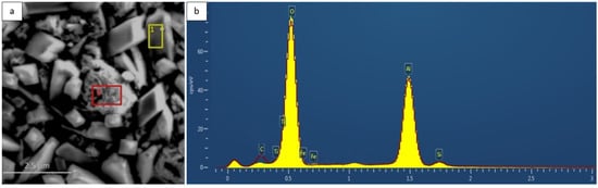 EDS analysis revealed that the oxide layer contained predominantly aluminum and oxygen, with trace amounts of Fe, Cr, and Ti (Figure 7). The presence of these substrate elements in the outer scale results from the relatively deep excitation volume during EDS measurements and local diffusion processes at the metal/oxide interface [10,11]. In some areas, minor Si contamination was observed, originating from the furnace lining material.