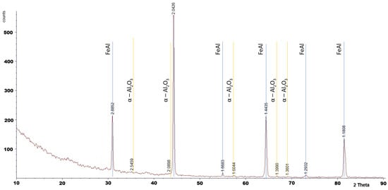 These observations indicate that both the morphology of corrosion products forming on FeAl-based intermetallic alloys and the kinetics of the oxidation process depend on the oxidation temperature and exposure time. All the above-mentioned researchers have noted that the needle-like oxide morphology is characteristic of the θ-Al2O3 phase. The morphology of oxides formed on the Fe40Al5Cr0.2TiB alloy obtained in this study can therefore be associated with the allotropic form of aluminum oxide present on the alloy surface. X-ray diffraction (XRD) analysis identified the presence of the α-Al2O3 phase. Importantly, the stable α-Al2O3 phase is generally recognized as a high-temperature modification of aluminum oxide, typically forming on the surface of oxidized materials at temperatures above 900 °C [31,35,36,37].
