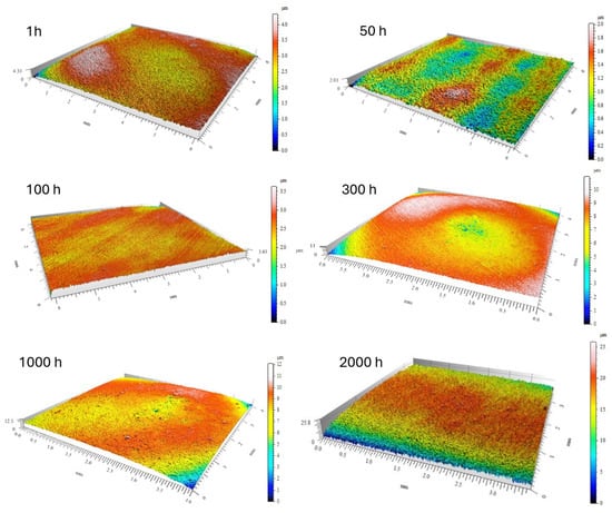 The evolution of surface roughness parameters with oxidation time, determined by optical profilometry, is summarized in Table 2. The mean roughness (Ra) and maximum height (Rz) showed an initial slight decrease after 50–100 h of exposure (Ra ≈ 0.09 µm, Rz ≈ 0.57 µm), suggesting that fine-grained alumina layers partially smoothed the surface (Figure 9 and Figure 10). However, after 2000 h, both Ra and Rz increased markedly to 0.83 µm and 5.79 µm, respectively, reflecting the formation of coarse α-Al2O3 nodules and localized delamination zones.