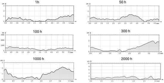 Waviness profiles on selected cross-sections of the sample surfaces after oxidation in a steam environment at 700 °C after different times.