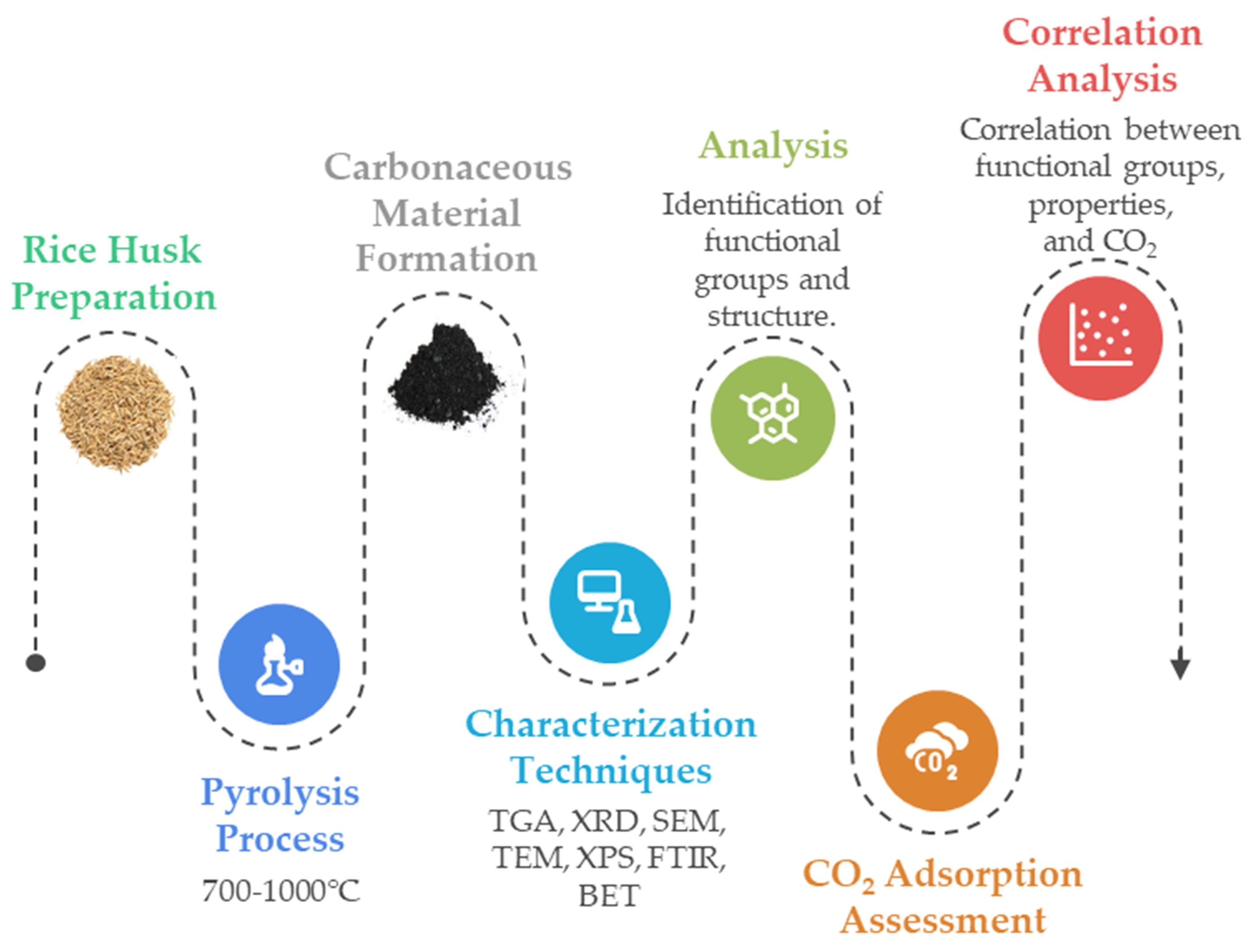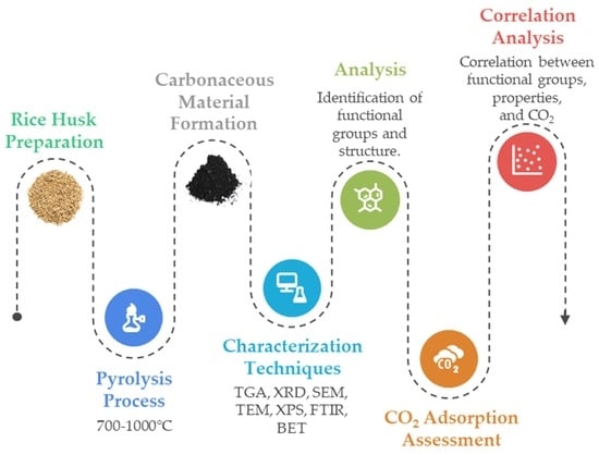 Comprehensive Characterization of Carbonaceous Material Derived from Rice Husk Pyrolysis and Its Potential for CO2 Adsorption