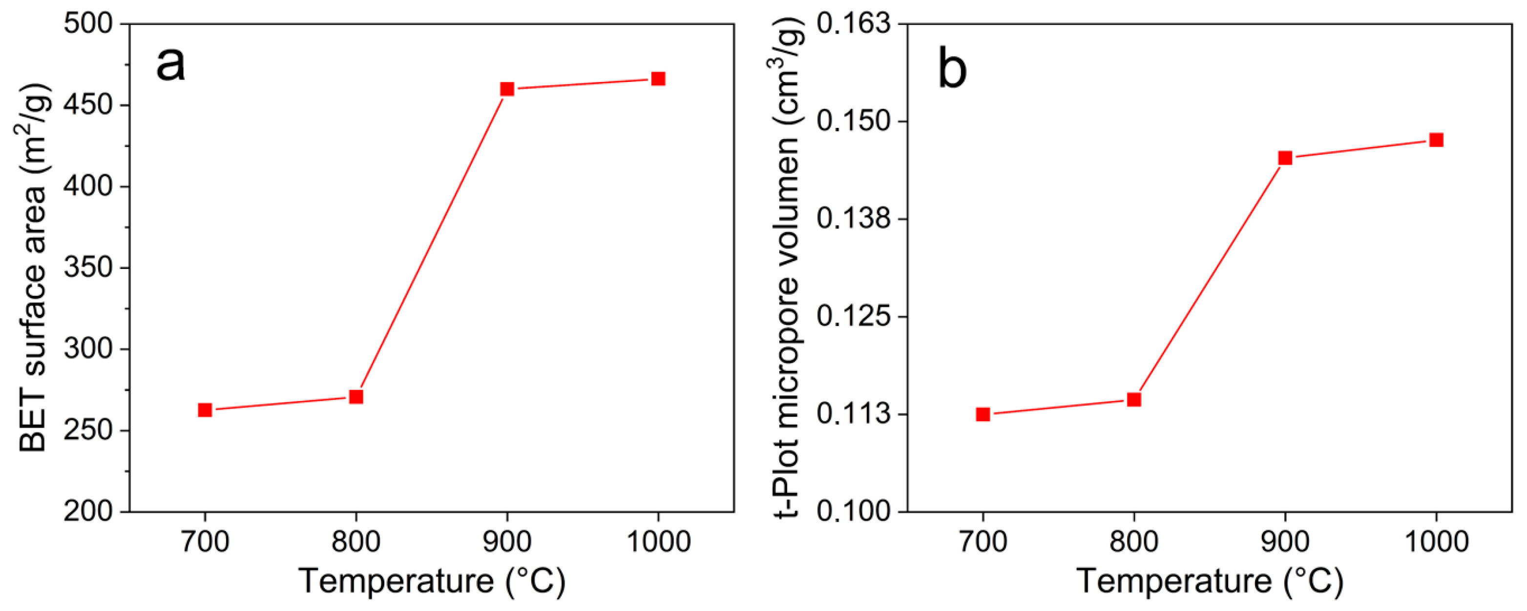 | Sample (°C) | SBET a | Smicro b | Sext c | Vtotal d | Vmicro e |