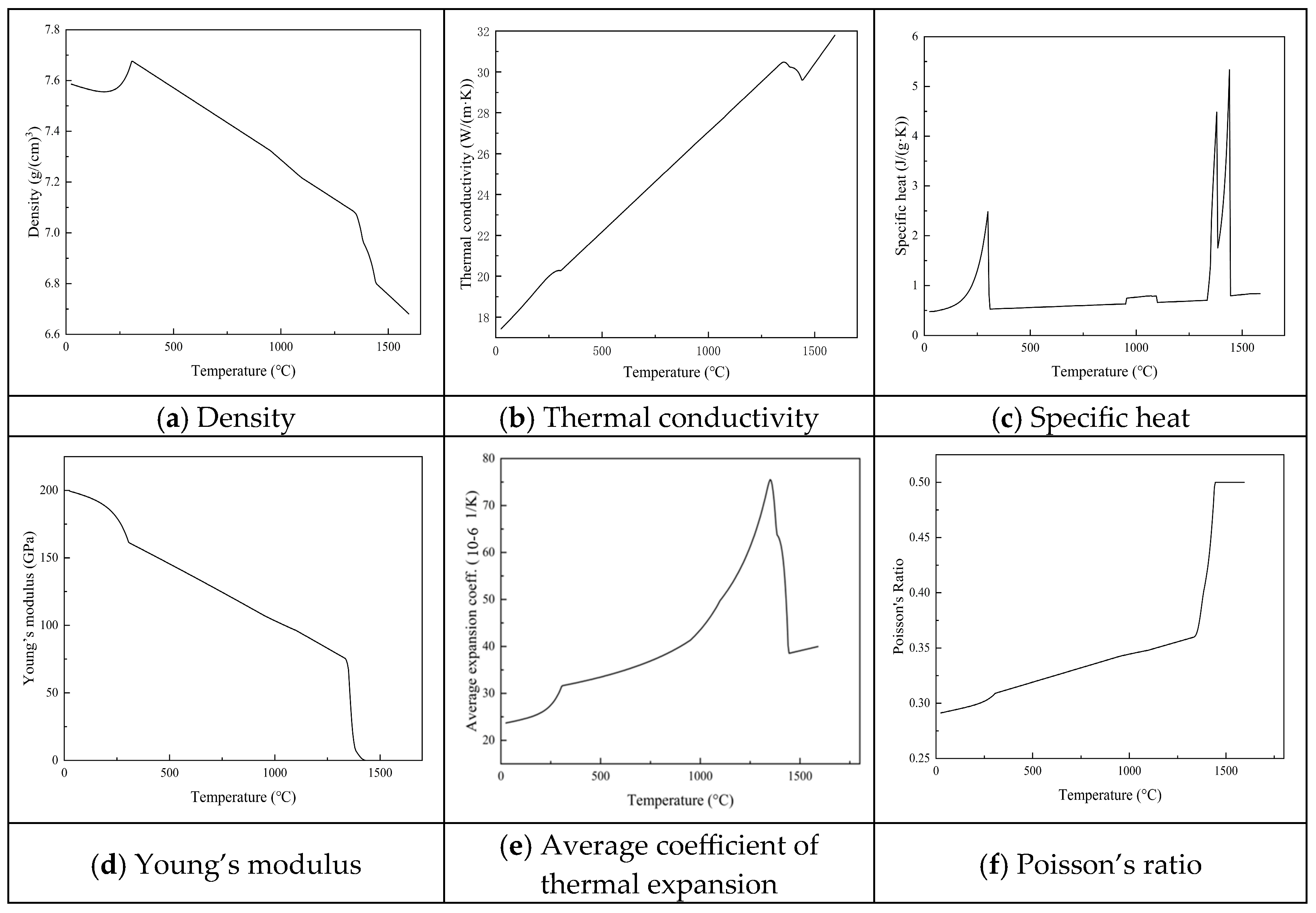 The temperature-dependent thermophysical properties, including density, thermal conductivity, specific heat capacity, Young’s modulus, the average coefficient of thermal expansion, and Poisson’s ratio, were calculated using JMatPro v12.1 and employed as input parameters for modeling the molten pool morphology and thermo-mechanical behavior during the PTA cladding process. Figure 2 illustrates the variation in these properties with temperature for the substrate material 45Cr9Si3 electroslag remelted, where panels (a)–(f) correspond to density, thermal conductivity, specific heat capacity, Young’s modulus, average thermal expansion coefficient, and Poisson’s ratio, respectively.