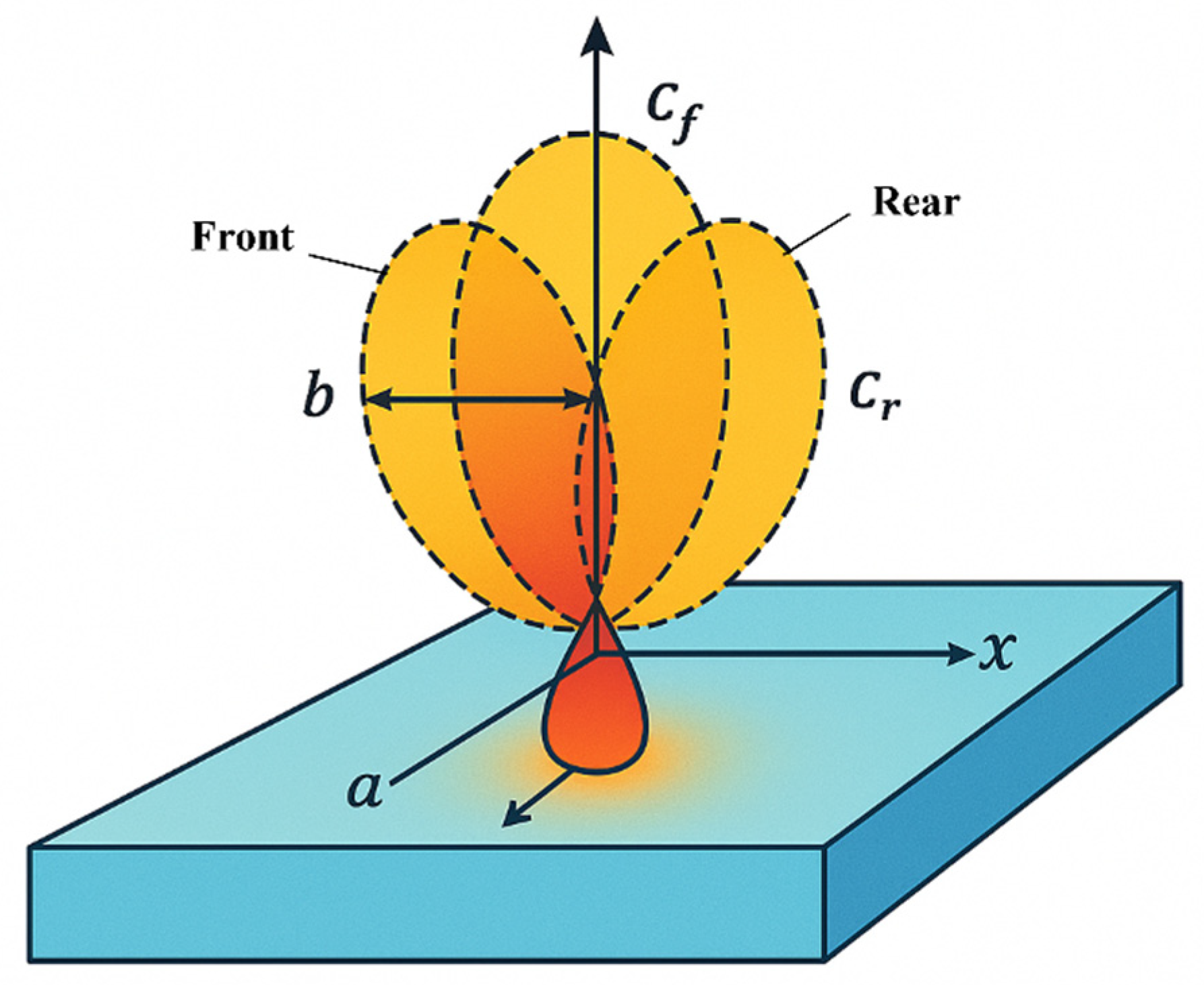 To accurately model the highly concentrated energy input characteristic of the Plasma Transferred Arc (PTA) process, a volumetric heat source based on the Goldak double ellipsoid model is employed. This semi-empirical model effectively captures the three-dimensional distribution of heat in the weld pool and is particularly suitable for arc-based processes involving asymmetrical thermal fields. The model divides the heat source into front and rear ellipsoidal regions, each described by its own semi-axes: a, b, c1 (front), and c2 (rear). The total heat input Q is distributed between these regions via two parameters, ff and fr, such that ff + fr = 2, ensuring energy conservation.
