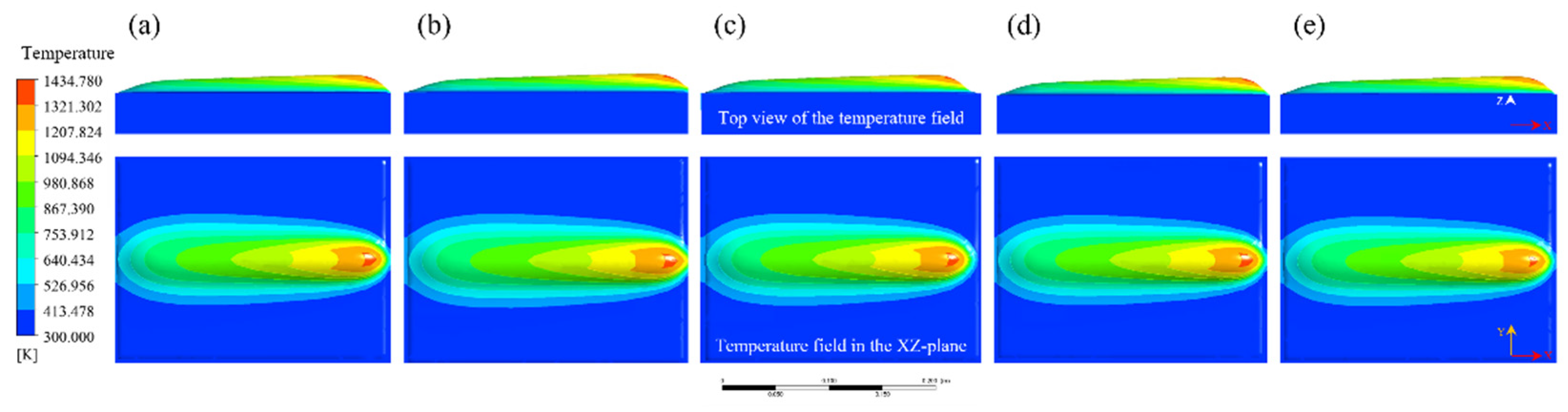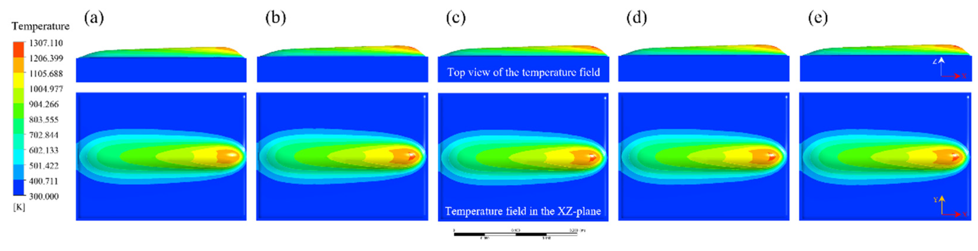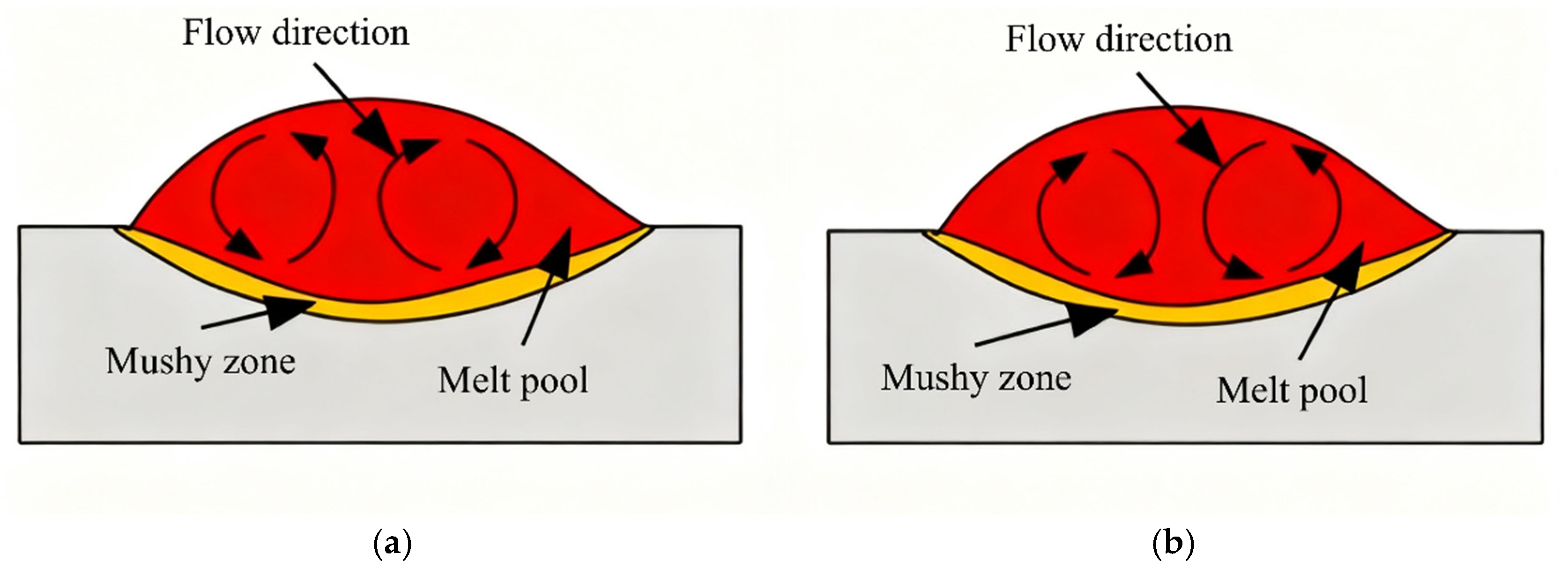 Flow within the molten pool is primarily governed by Marangoni convection, driven by surface tension gradients. The direction of this flow depends on the sign of the Marangoni coefficient. As shown in Figure 7, a negative coefficient (a) causes outward surface flow, while a positive coefficient (b) leads to inward circulation. These variations influence the distribution of heat and molten material, thereby affecting the stability and geometry of the melt pool [23,24].