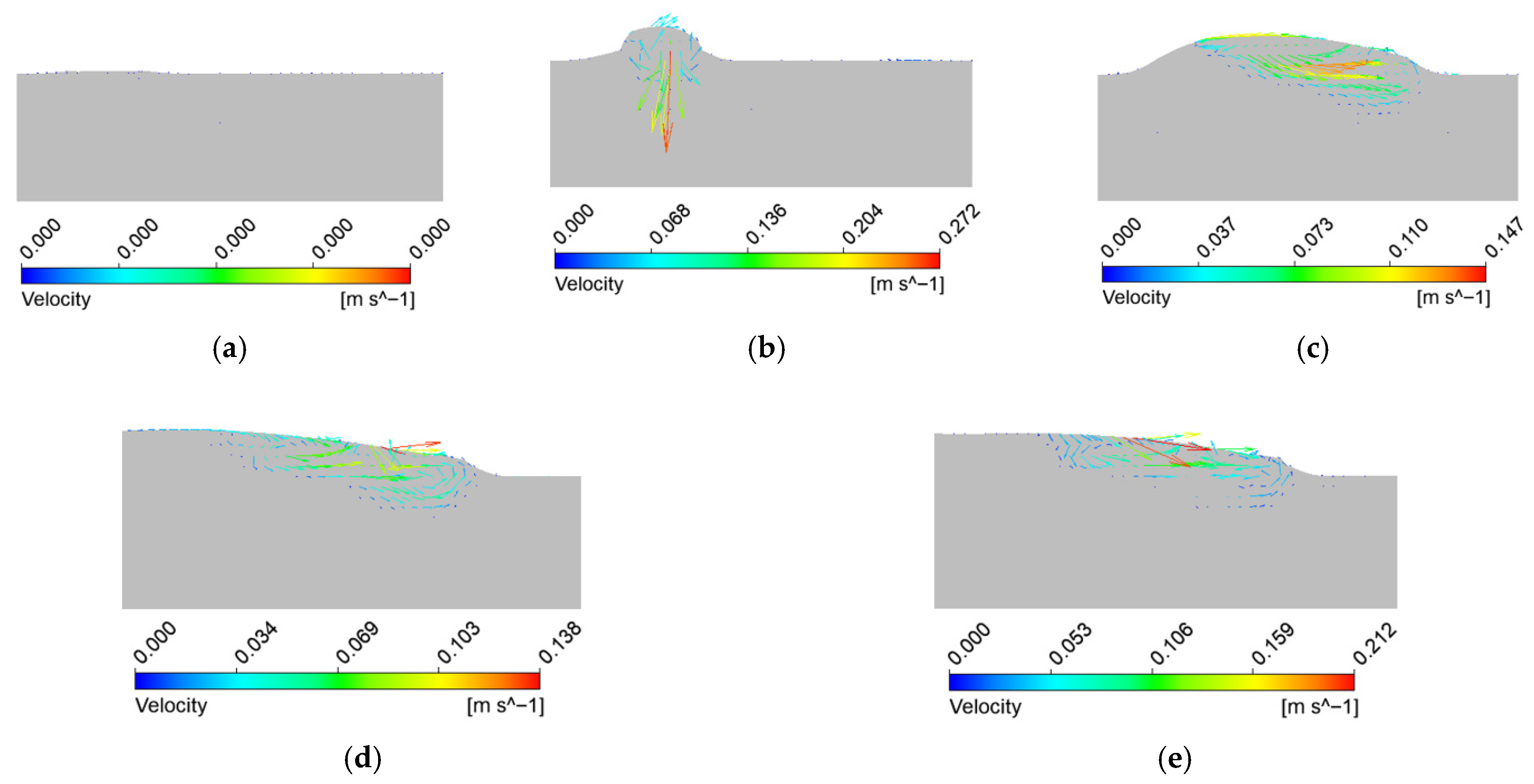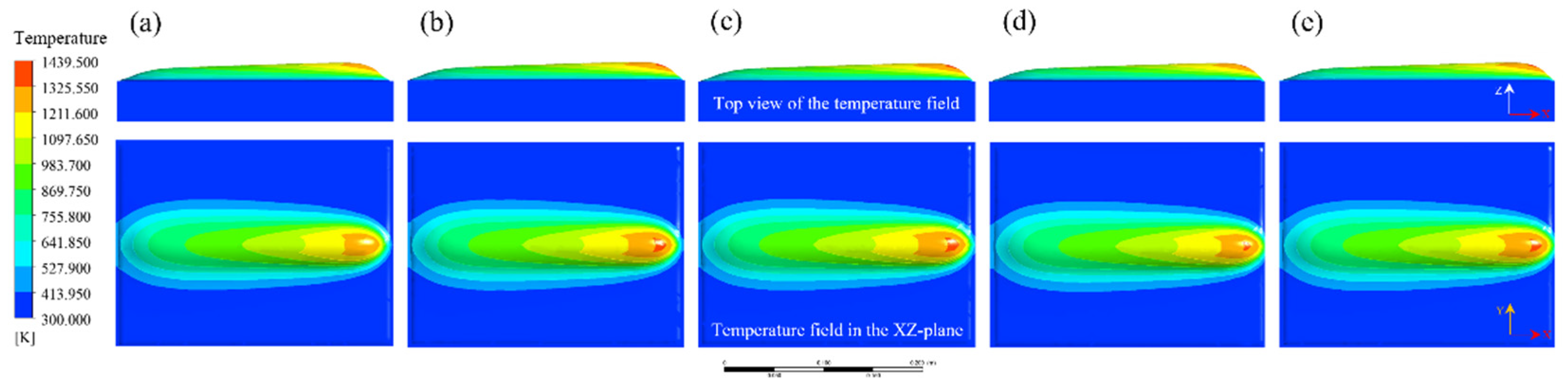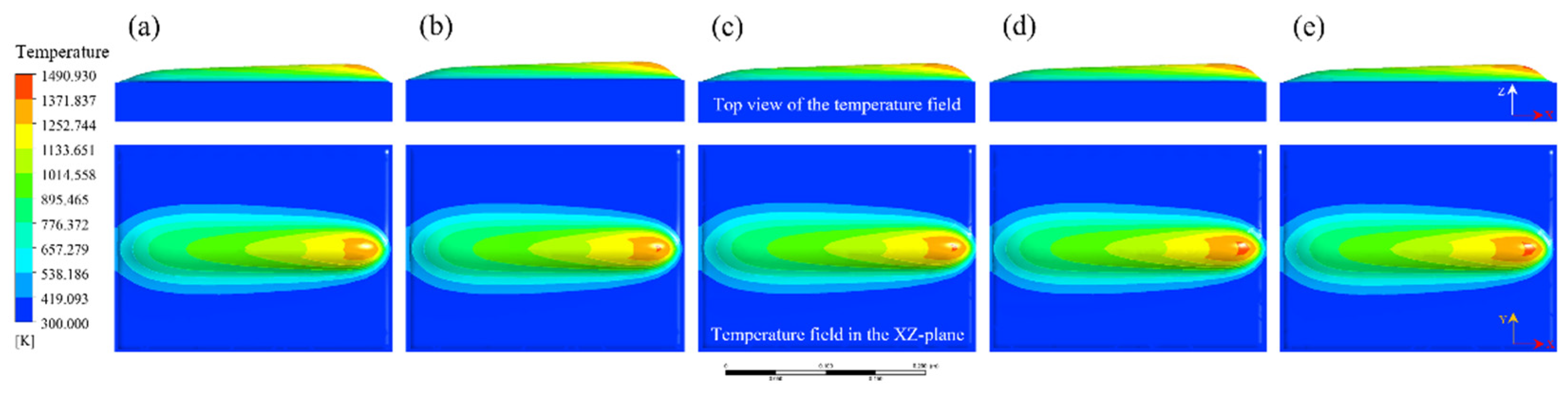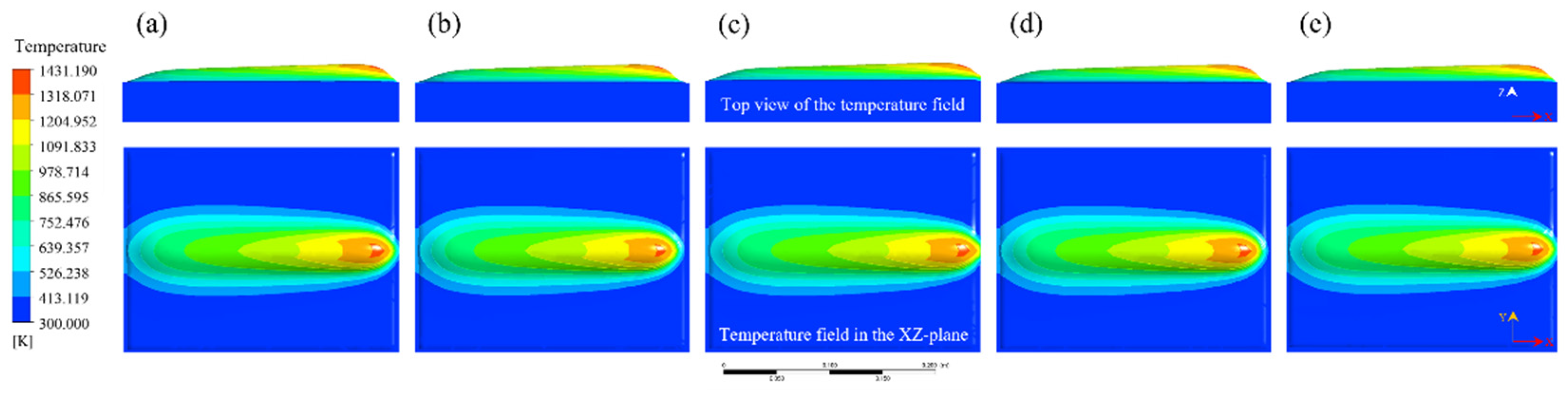 Flow within the molten pool is primarily governed by Marangoni convection, driven by surface tension gradients. The direction of this flow depends on the sign of the Marangoni coefficient. As shown in Figure 7, a negative coefficient (a) causes outward surface flow, while a positive coefficient (b) leads to inward circulation. These variations influence the distribution of heat and molten material, thereby affecting the stability and geometry of the melt pool [23,24].