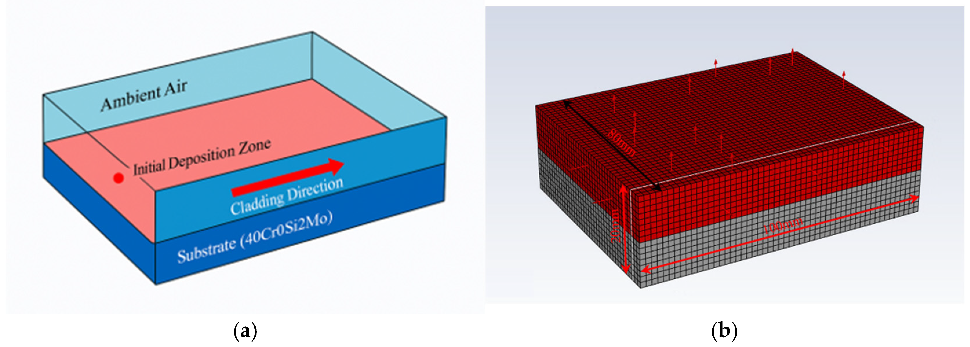 Prior to deposition, the 45Cr9Si3 electroslag remelted steel coupons (100 mm × 50 mm × 10 mm) were precision-machined to the desired dimensions, followed by surface preparation involving mechanical grinding to eliminate oxides and machining marks. Subsequently, the samples were degreased in acetone and preheated to 150 °C for 30 min, which moderately reduces thermal gradients and helps reduce residual stresses
