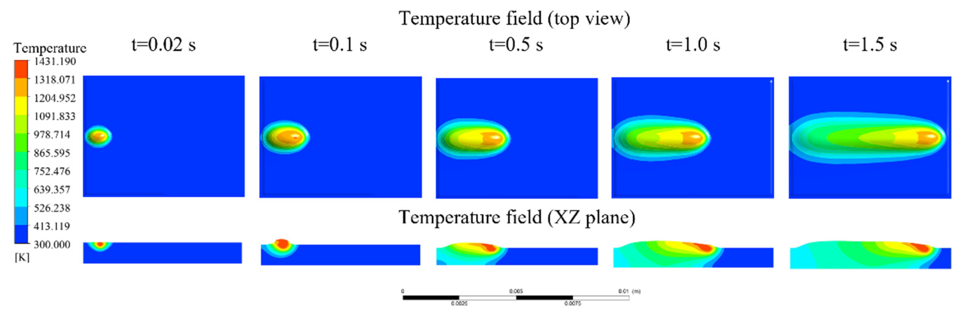 During simulation, the volumetric heat flux q(x,y,z) acts as a source term in the energy conservation equation, and is dynamically updated at each time step based on the current position of the heat source along the predefined scanning path. Calibration of the model is typically performed using experimental weld bead profiles, thermal measurements, or cross-sectional metallographic analysis to ensure predictive accuracy.