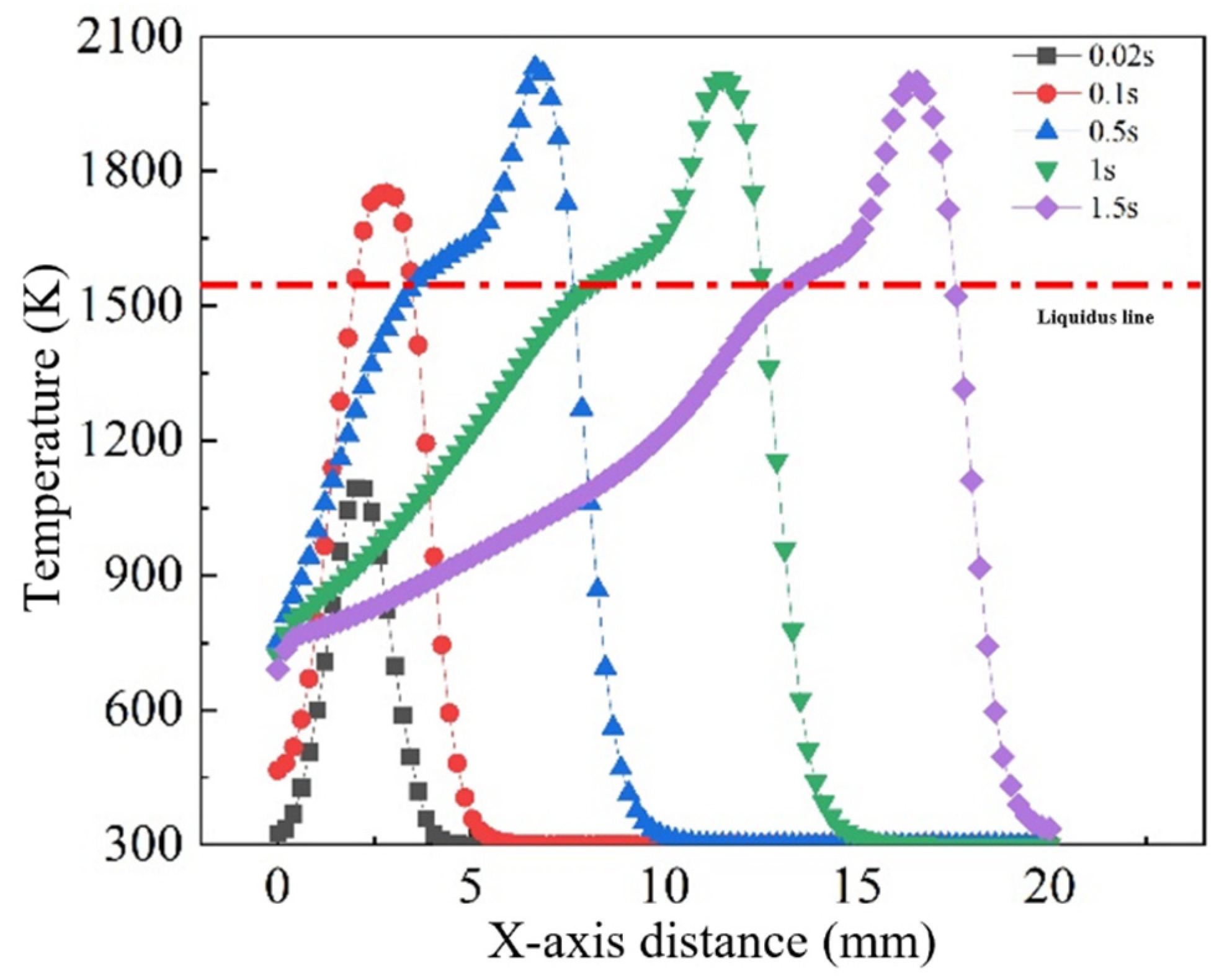 Material properties are modelled as temperature-dependent. Density ρ(T), thermal conductivity k(T), specific heat cp(T) and dynamic viscosity μ(T) for the clad material and substrate are defined using experimentally reported curves. For example, in one study of molybdenum alloys fabricated by selective laser melting, the thermal conductivity of the powder bed is much lower than that of the solid metal and is simplified according to an empirical formula that considers porosity and radiation amongst particles. The viscosity and surface tension are also defined as functions of temperature, with a negative temperature coefficient of surface tension—this enables accurate representation of Marangoni convection. The damping constant used in the enthalpy–porosity method (often around 104–106) is chosen to ensure a sharp transition between liquid and solid phases.