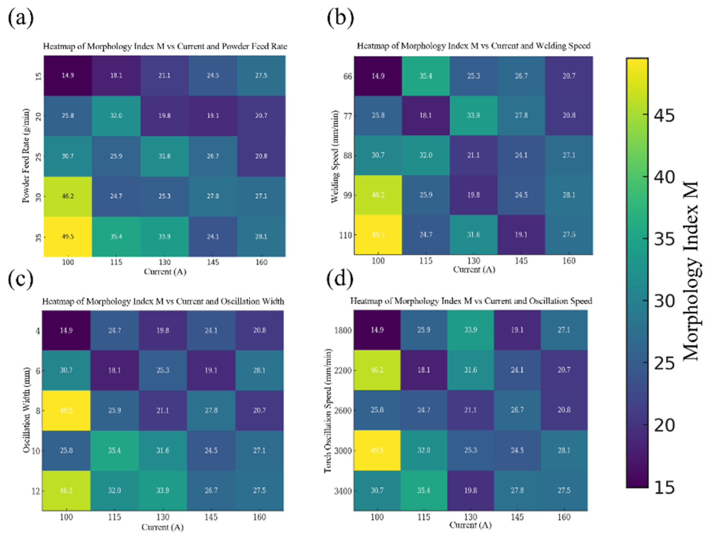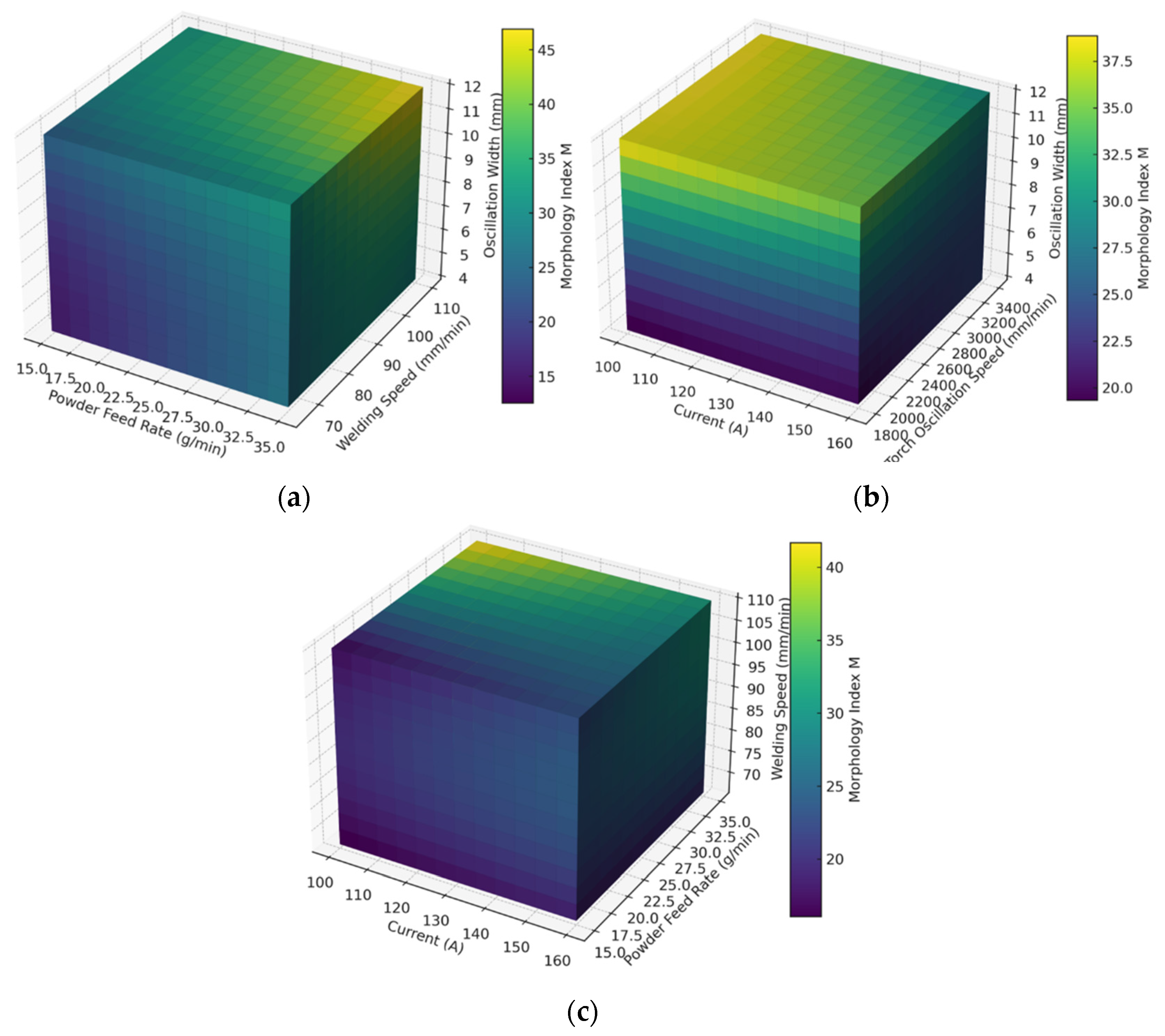 Figure 19. Three-dimensional plots of the Morphology Index (M) under different process-parameter combinations in plasma cladding. (a) Powder Feed Rate–Welding Speed–Oscillation Width; (b) Current–Torch Oscillation Speed–Oscillation Width; (c) Current–Powder Feed Rate–Welding Speed.