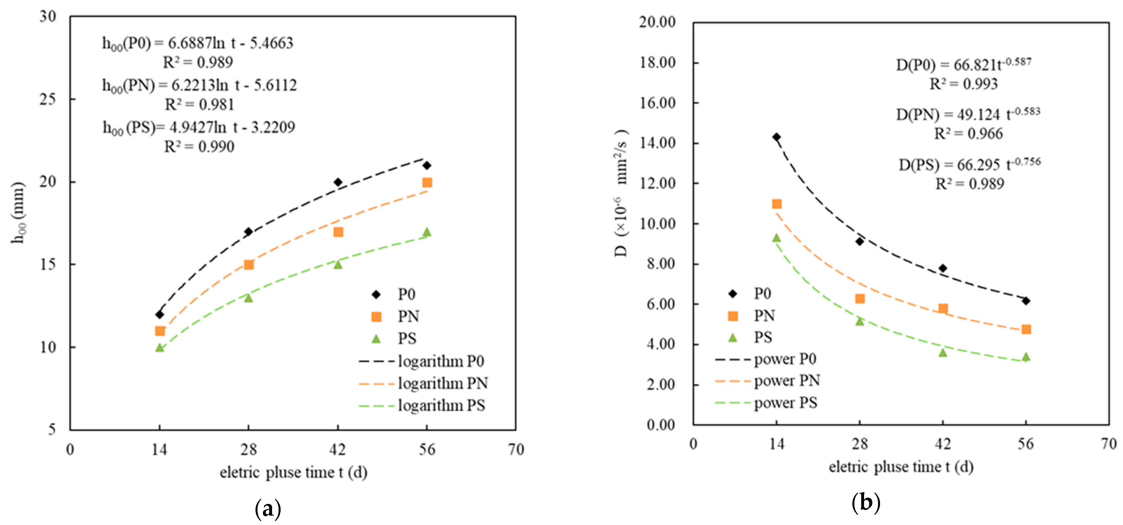 3.2. Calculation of Sulfate Ion Migration Parameters in PMPC Specimens