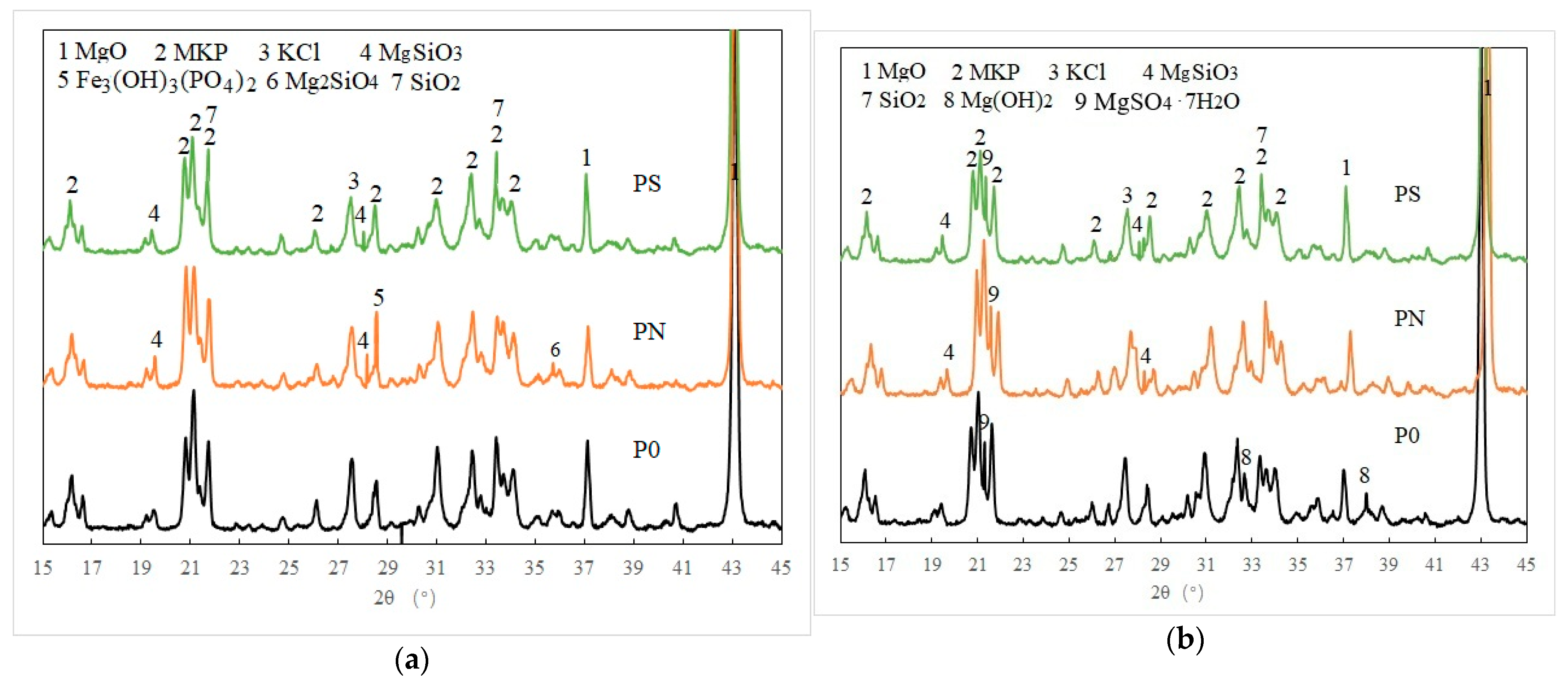 - Xu, C.; Han, J.; Yang, Y. A review on magnesium potassium phosphate cement: Characterization methods. J. Build. Eng. 2024, 82, 108284. [Google Scholar] [CrossRef]