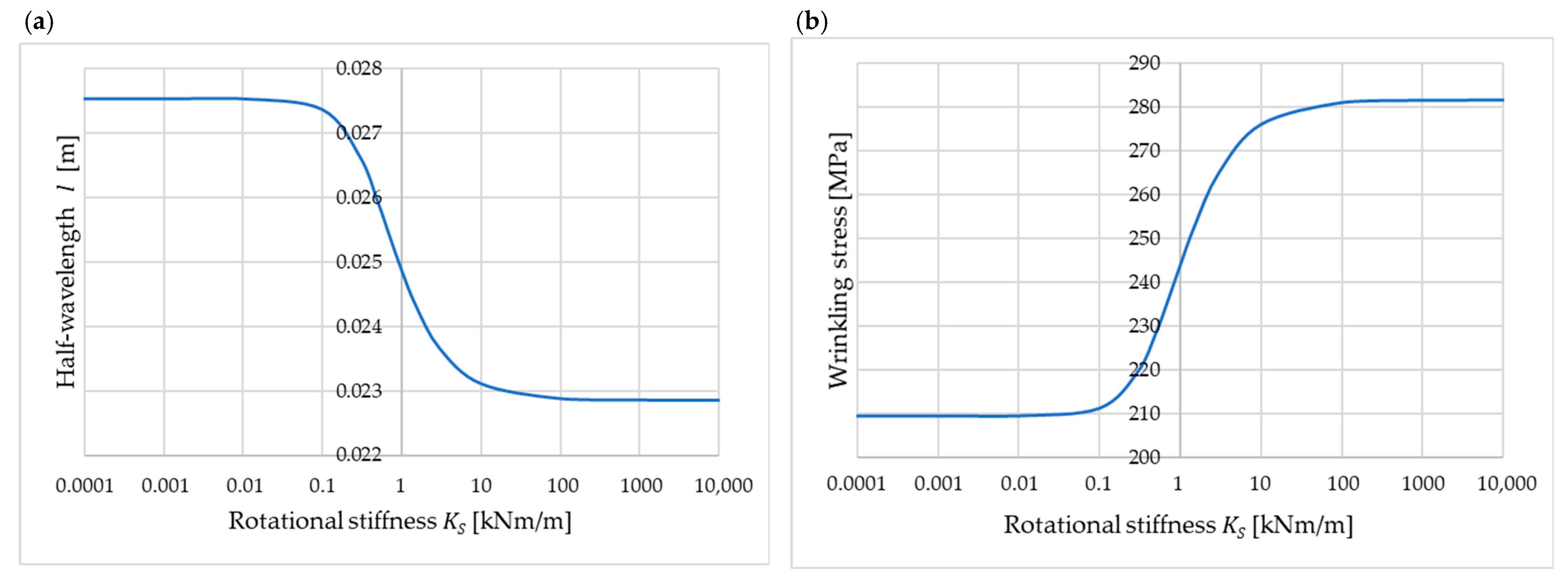 In the next stage of considerations, the derived equations were used, and exemplary solutions for the basic forms of the deformation function were presented. The presented theoretical approach enabled us to demonstrate that a significant increase in wrinkling stresses occurs for a bandwidth of less than 0.10 m. In addition, values corresponding to different support conditions of the band were obtained because the range of wrinkling stresses obtained in practice was known. To the authors’ knowledge, the results presented have not been previously obtained based on theoretical considerations.