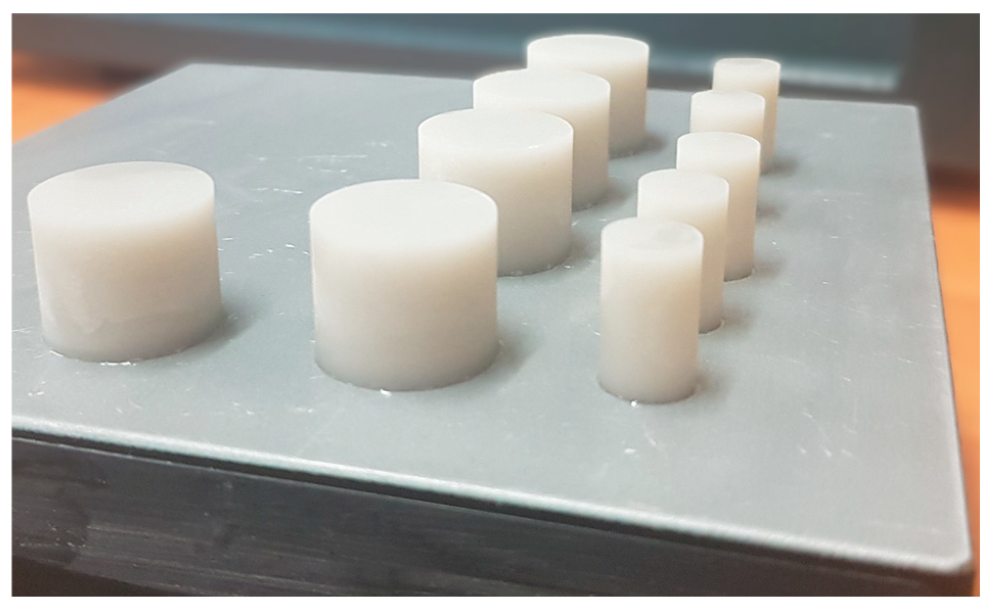 34], there are still few consistent and systematic studies that correlate the geometry of the printed element (height, diameter, layer thickness) and the burnout procedure with the sintering process and the results of mechanical tests, such as compression tests, particularly for commercial resins. Typically, only the manufacturers’ data specifying the parameters required to obtain defect-free prints are available [
