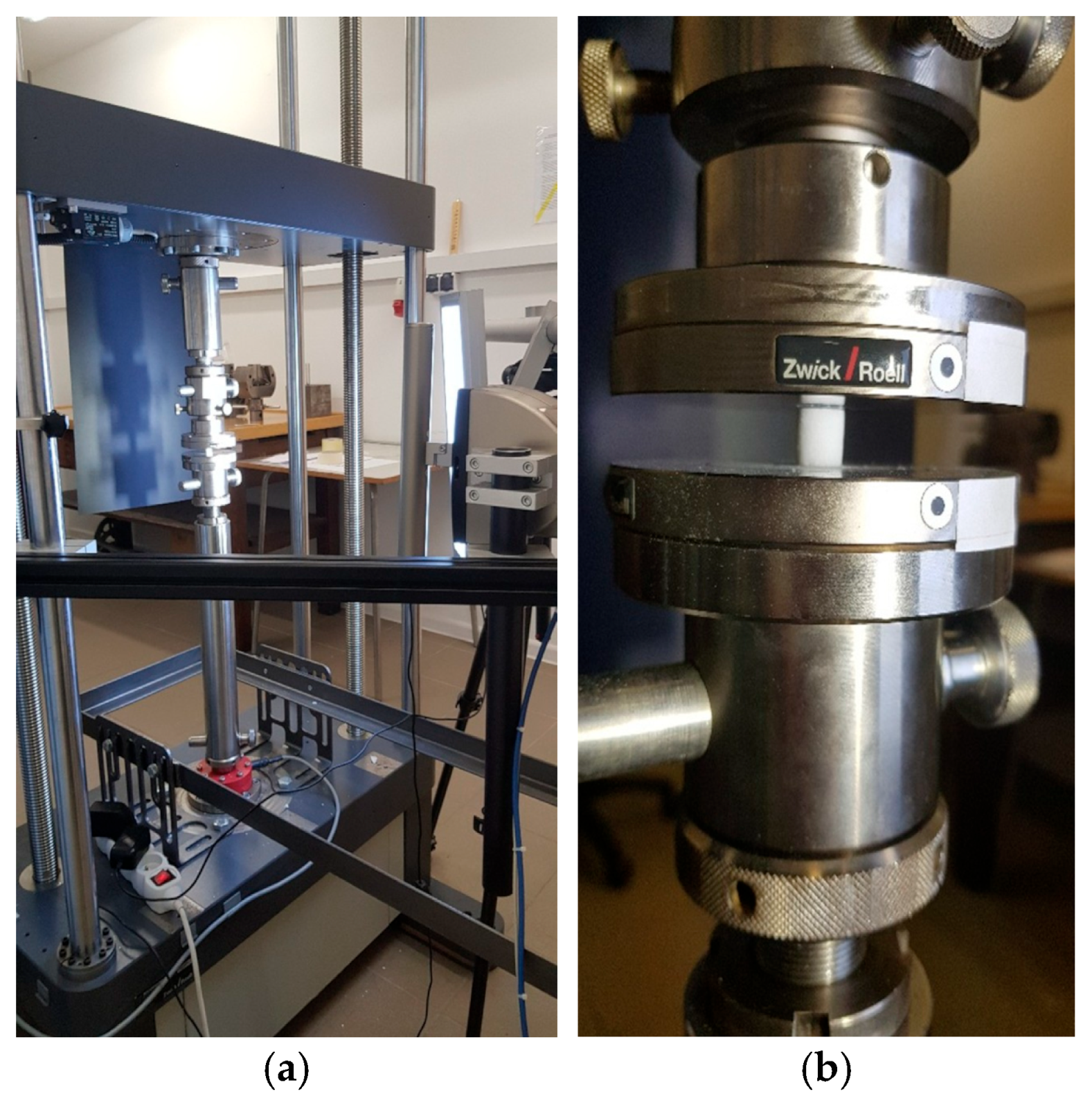 The measurements were carried out at room temperature with a crosshead speed of 2 mm/min. Strain was recorded using a Zwick/Roell video extensometer, which enabled precise determination of the stress–strain curve. Based on the recorded data, the compressive Young’s modulus (E