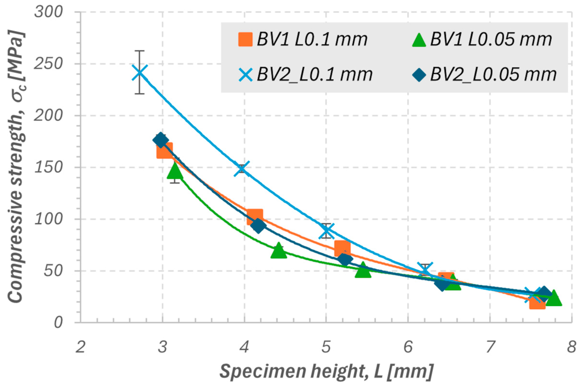 The highest values of both mechanical parameters were obtained for samples produced according to the second heating variant (BV2) with a layer thickness of 0.1 mm. This variant, which applied an individualized burnout time, promoted more complete removal of the polymer matrix and reduction in micropores within the structure, resulting in increased stiffness and strength. The differences between the burnout variants (BV1 and BV2) are less pronounced than those observed between different layer thicknesses. Therefore, the 0.1 mm layer thickness represents the dominant factor determining the material’s ability to carry axial loads. Young’s modulus (Ec) exhibits greater variability than compressive strength (σc), which corresponds to its higher sensitivity to local structural inhomogeneities, defects in interlayer zones, and variations in the degree of particle bonding. In the samples with the smallest height (approximately 3 mm), the highest Ec and σc values were recorded, accompanied by the largest data scatter. This may result from the difficulty in ensuring uniform densification conditions in small material volumes and the greater influence of surface microstresses and differences in the topography of the printed layers. Conversely, the samples with a height of 4 mm exhibited the smallest scatter of results while maintaining high mechanical parameter values. Therefore, this dimension was selected as representative for further stages of the study, providing a balance between repeatability, uniformity, and appropriate resolution of the printed structure.