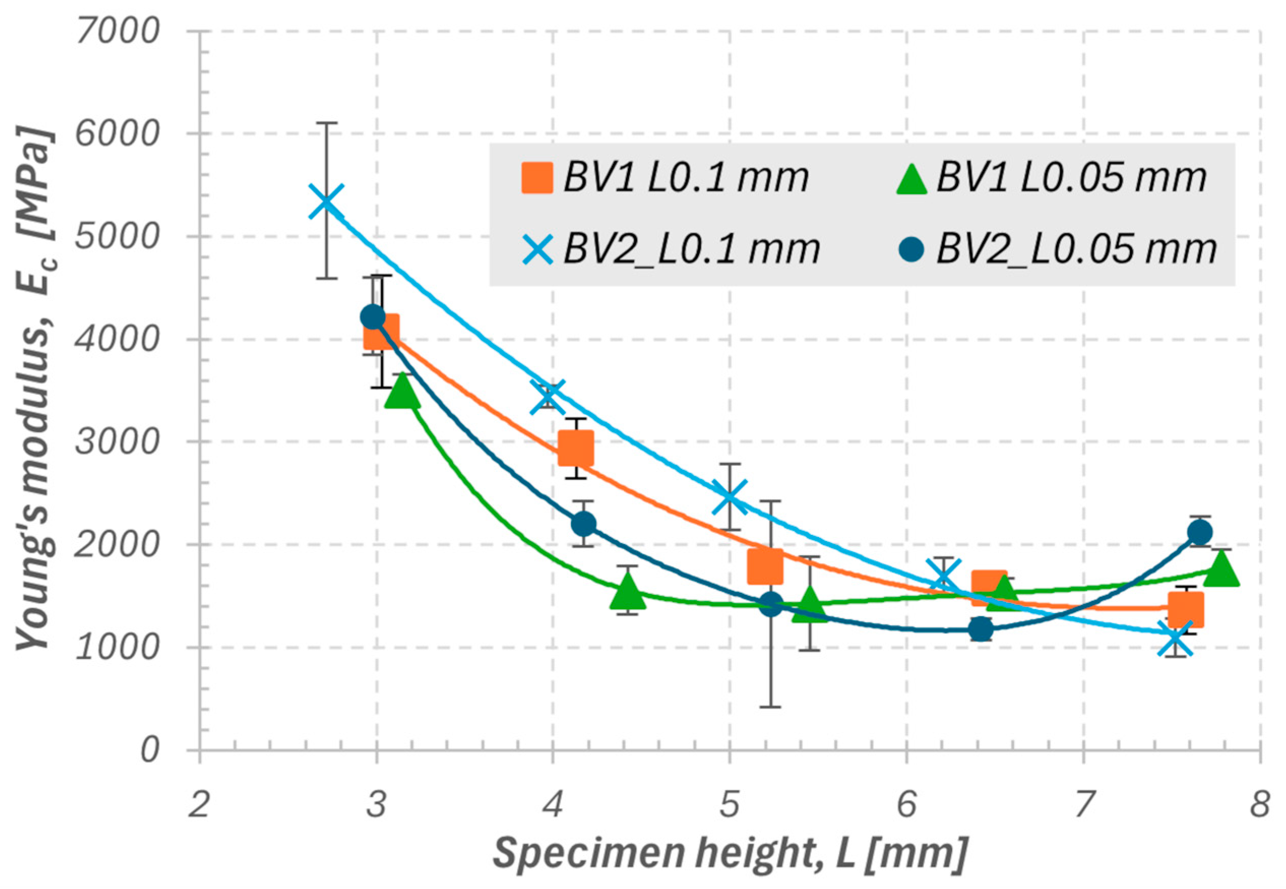 Increasing the sample height results in a decrease in Young’s modulus (Ec) and compressive strength (σc), which is attributed to geometric effects and increasing structural inhomogeneity along the printing axis.