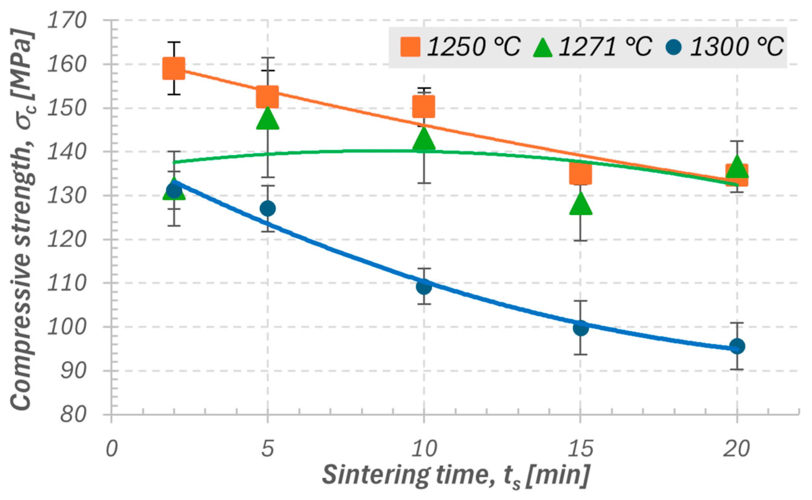 The most favorable properties (high σc and Ec with low data scatter) were obtained at temperatures of 1250–1271 °C and sintering times of 5–10 min, confirming a stable and efficient thermal process.