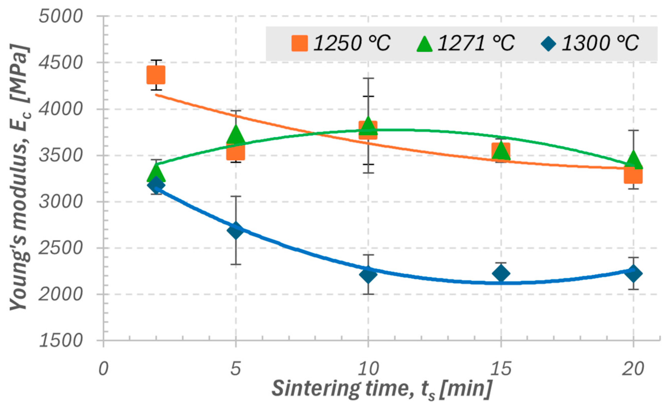 For the shortest sintering time (2 min), the standard deviations were the smallest across all analyzed temperatures, confirming the beneficial effect of a short thermal cycle on process stability and repeatability. The most favorable mechanical properties were obtained within the temperature range of 1250–1271 °C and a sintering time of 5–10 min. Under these conditions, the samples exhibited high strength, good stiffness, and low data scatter. At 1300 °C, a small scatter of results was also recorded; however, this was due to the repeatable degradation of the structure. The samples sintered at this temperature underwent similar levels of overheating and vitrification, resulting in comparable but lower mechanical property values.