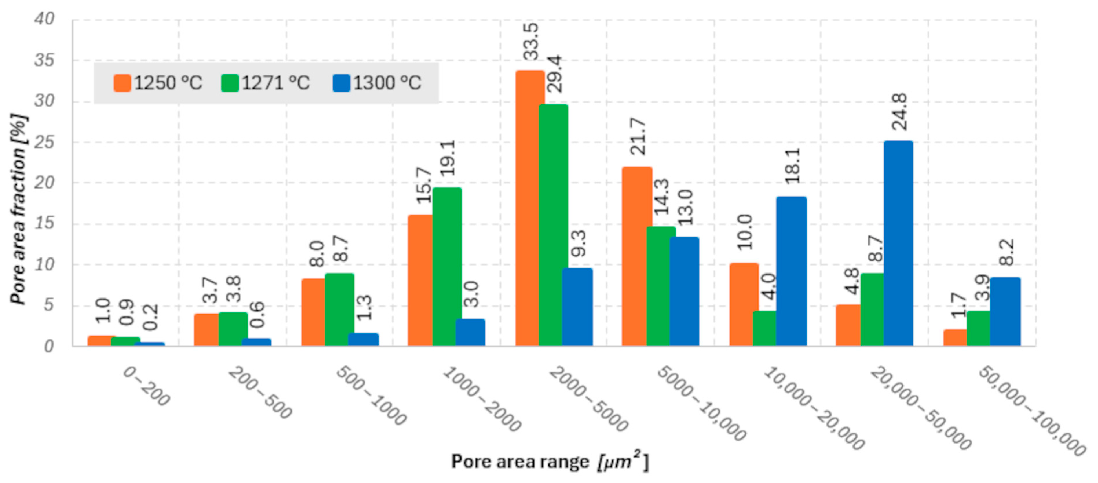 Figure 12). The highest pore area fraction for the samples sintered at 1250 °C and 1271 °C occurs in the range of 2000–5000 µm