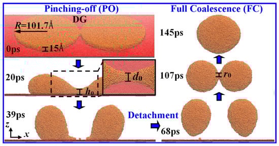 Figure 9 shows the sizes of the tiny bridge as a function of time, including the minimum width (d0), height (h0) and radius (r0). d0 and h0 show a steep decline before the pinching point, while r0 displays a linear increase, but all these sizes are proportional to tk, characterized as d0~t2, h0~t3 and r0~t, which indicates that the dynamic of the bridge exhibits self-similarity at both the PO and FC stages. Compared to d0, h0 displays a sharp decrease. The overlap of the r0-t curves for different systems and the same scale r0~t indicate that the self-similarity at the FC stage is independent of the substrates. In addition, the rescaled profiles reveal that the self-similarity at the FC stage is remarkable within 10 ps and becomes weak as the drops coalesce. However, the exponent of each stage for the Cu droplet is much larger than that for the ambitious spherical drop scaling with h0~t2/3 at the PO stage and h0~t1/2 at the FC stage [,], which implies that the formation of the high-temperature liquid drop exhibits a quite different dynamic.