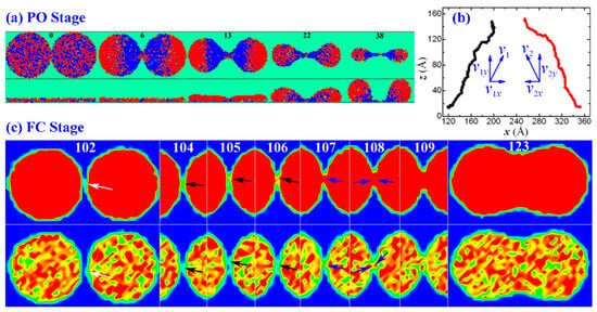To gain insight into the mechanism behind the complexity of the drop formation, we analyze the motions of the bridge and Cu drops. Figure 2a shows the time-evolution velocity fields of the bridge and Cu drops along the x and z directions. With respect to the bridge, the motion along the x direction (top view) shows that the number of Cu atoms that move toward the center (red) is much smaller than the number that move away from the center (blue), and these further decrease as the process proceeds. This suggests that the motion away from the center plays a dominant role. Moreover, the motion along the z direction (side view) shows that the bridge has the tendency to vanish due to the dominant role of the downward motion (blue) in this direction. Due to the combined effect of the dominant motions in these two directions, the bridge disappears faster than it grows after a certain timescale, resulting in the PO. In terms of each drop, it mainly contracts to its center at the beginning, i.e., from 0 to 13 ps, but the tendency of each drop to move to the bridge becomes more obvious after 13 ps due to the increase in the number of the atoms that move to the bridge (red). A better understanding of this trend can be gained by the trajectory profiles of the two drops in the xoy plane, as shown in Figure 2b. Clearly, every drop gradually and consistently approaches the other drops before the FC stage. The velocity component in the x direction gives rise to the contact and the FC of Cu drops, and the velocity component in the z direction of each Cu drop leads to its detachment. That is to say, though the vanishment of the bridge occurs, the separating drops tend to approach each other, paving the way for the FC stage. Figure 2c presents the time-evolution density profiles (the top row) and coordination distribution (the bottom row) in order to illustrate the FC stage and the dynamic of the liquid–liquid interface. The FC of Cu drops undergoes three steps. Firstly, near the coalescing region, the surface of the right drop firstly becomes protuberant, which is denoted by white arrows in the first snapshot (t = 102 ps) at the top row. This step is quite similar to the gas drainage in the liquid coalescence in real space. Secondly, the surfaces of Cu drops break up at t = 104–106 ps (marked by the black arrows), resulting in the formation of a new liquid bridge. Thirdly, the newly formed bridge grows up at t > 106 ps (labeled by blue arrows) until the FC of the Cu drops. The fluctuations on the drop surface indicate that the liquid–liquid interface emits capillary waves to the drop surfaces, and this is of significance in the spontaneous process of droplet coalescence [,].