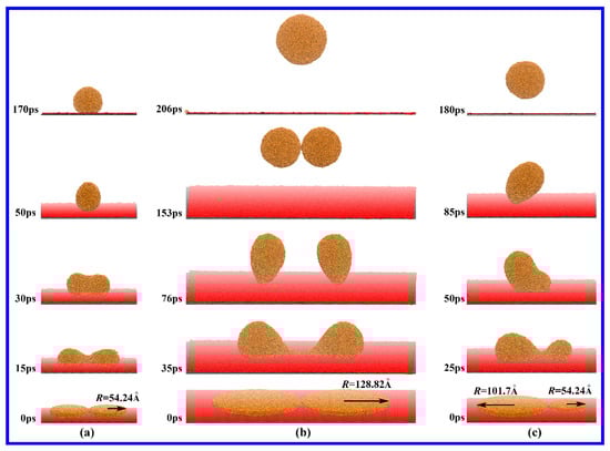 Snapshots of the drop formation from two liquid Cu films that have just come into contact on DG. All the films are in the thickness of 15 Å. The radius (R) of the film is labeled by the black arrow. (a) R = 54.24 Å for both films, (b) R = 128.82 Å for both films, (c) R = 54.24 Å for one film and R = 101.7 Å for the other film.